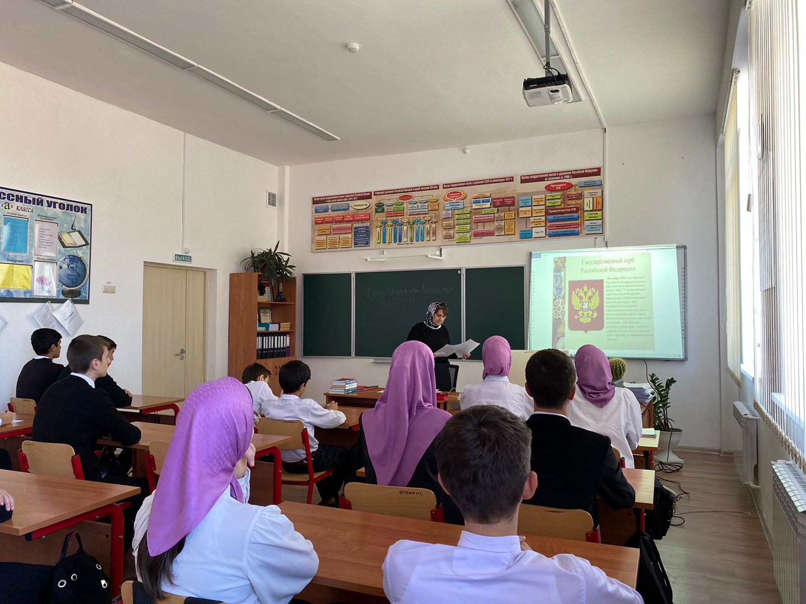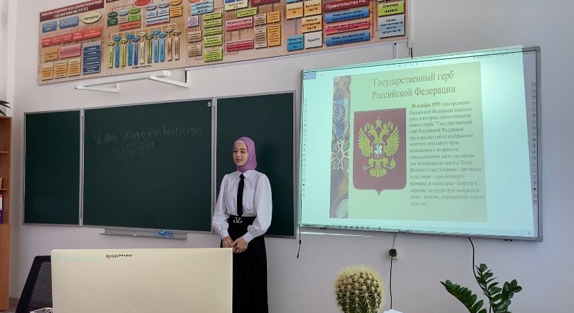 Важной частью классного часа была беседа о символическом значении каждого элемента герба. Ученица Устарханова Раяна провела небольшое исследование и поделилась с остальными интересными фактами о государственных символах. Оказалось, что шесть орлов на щите герба символизируют шесть регионов России, и каждая стрела в когтях орла представляет основные направления: север, юг, запад, восток. Таким образом, герб России объединяет в себе всю страну и ее разнообразие.