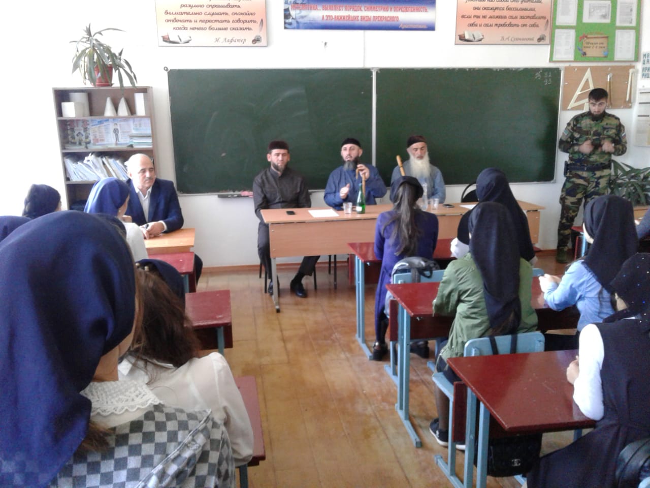 24.09.2018Кадий Веденского района Арби Джафаров в рамках исполнения поручения Главы ЧР, Героя России Рамзана Ахматовича Кадырова провел профилактическую беседу с учащимися нашей школы в рамках реализации Единой концепции духовно-нравственного воспитанияи развития подрастающего поколения республики. В своем выступлении богослов отметил, что перед молодыми людьми открыты все дороги, и каждый должен понимать, что главное для него-это получить образование и вести здоровый образ жизни. Он также призвал молодежь слушаться своих родителей, повышать уровень знаний и заниматься богоугодными делами.